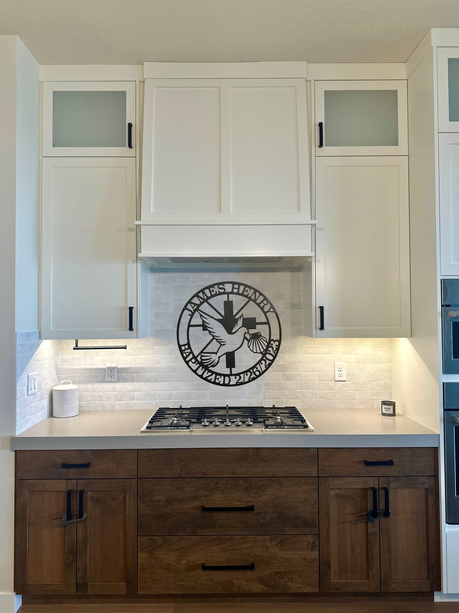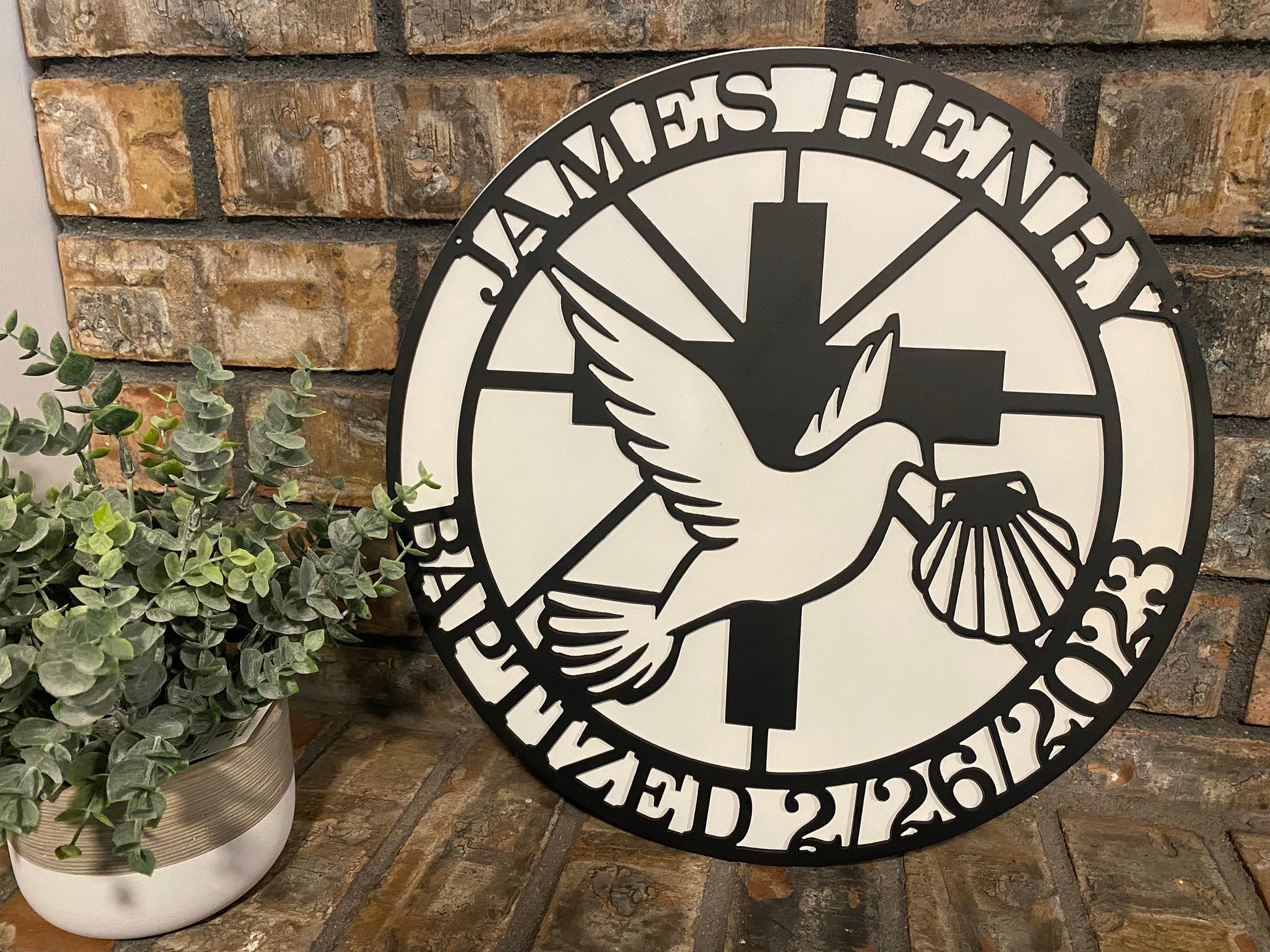 Commemorate your child's baptism with this striking personalized steel sign. Crafted from durable 14 gauge steel and finished in elegant black powder coat, it's built to last through years of cherished memories. Simply provide the name and baptism date, and we'll create a one-of-a-kind piece that celebrates this sacred milestone. Perfect for displaying in your home's domestic church space, this custom gift serves as a meaningful reminder of faith and family. A timeless keepsake that honors the spiritual significance of the day while adding distinguished character to any room.