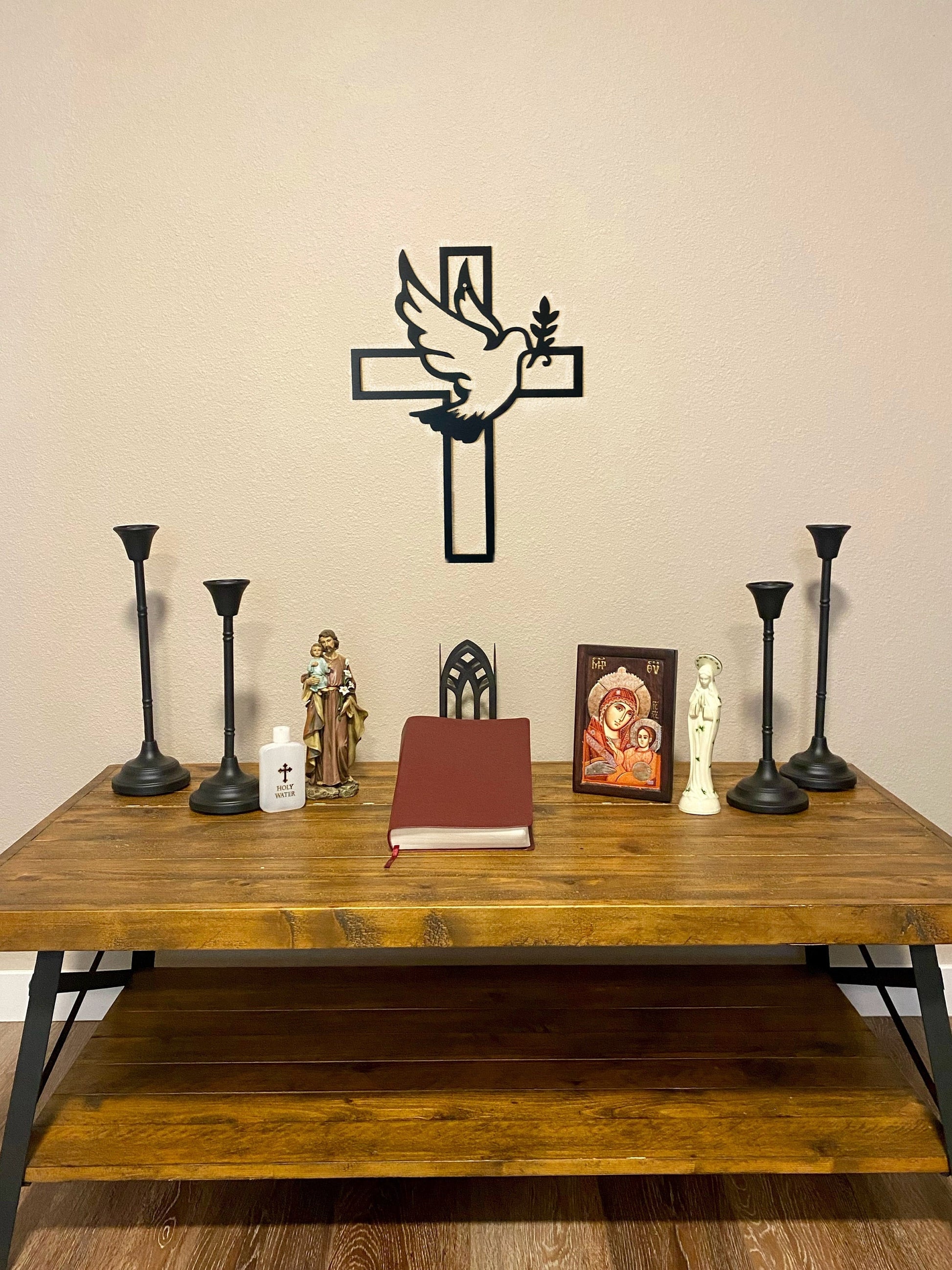 This striking metal cross brings divine inspiration right into your home. Crafted from sturdy 14 gauge steel and finished in sleek black powder coat, it features a graceful dove symbolizing the Holy Spirit soaring across the design. Perfect for your domestic church or any sacred space, this piece combines spiritual meaning with modern aesthetic appeal. A conversation starter that celebrates faith with style and substance.