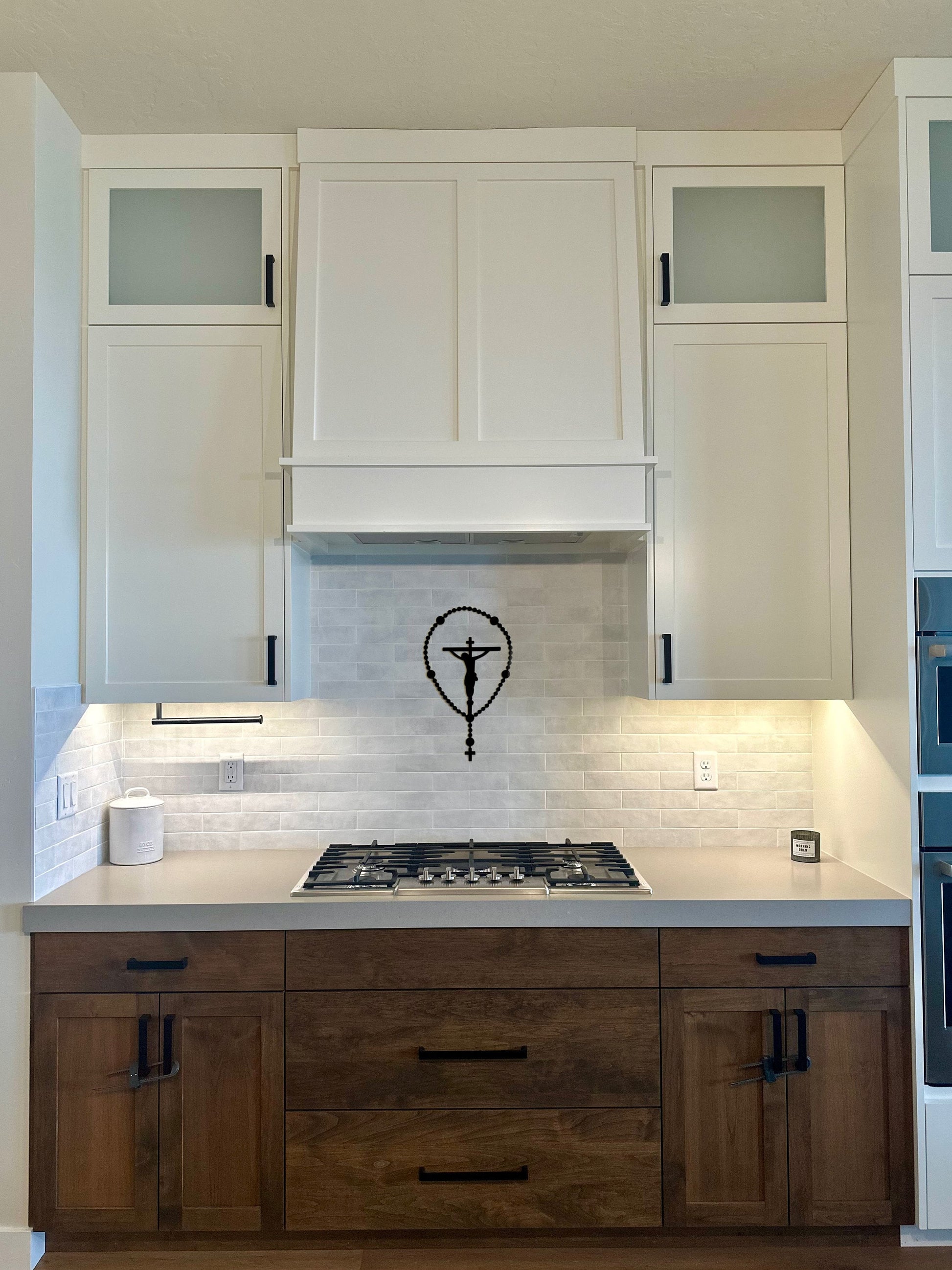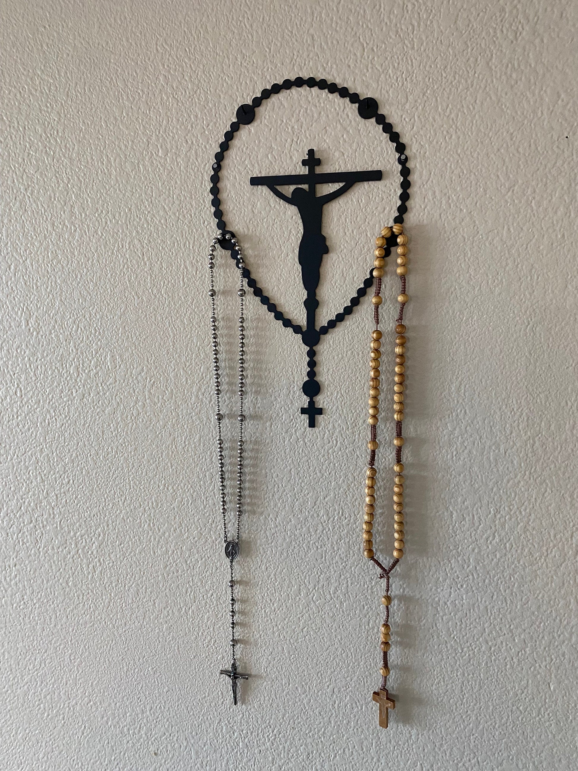 Organize your prayer practice in style with this sleek Crucifix Rosary Hanger. Crafted from sturdy 14 gauge steel and finished in a matte black powder coat, it features five strategically placed hooks on each decade—perfect for displaying your rosaries and keeping them within arm's reach during your daily devotions. Whether you're setting up a home altar or creating a dedicated prayer corner, this hanger brings both function and faith to your domestic church.